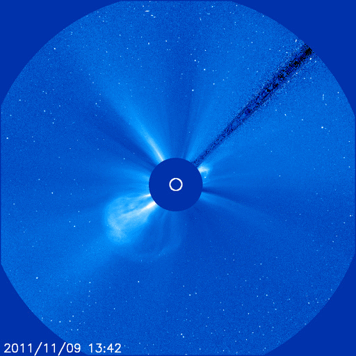 "Although the eruption was not squarely aimed at Earth, the CME is likely to deliver a glancing blow to our planet's magnetic field on Nov. 11th or 12th. This could add to the impact of another CME already en route. The earlier cloud was propelled by a filament eruption (movie) on Nov. 7th and is also expected to deliver a glancing blow on Nov. 11th." Space Weather
